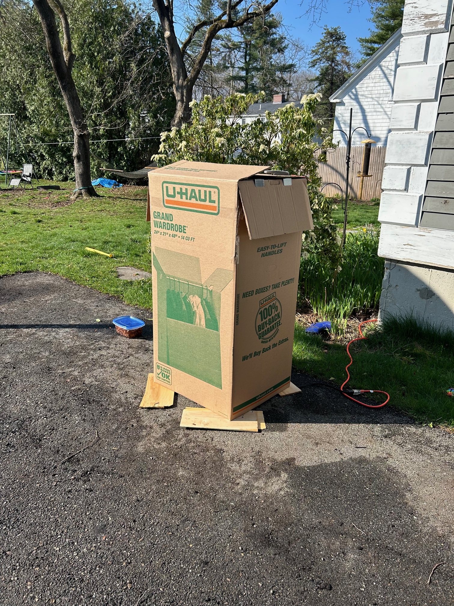 This time I used a "Grand Wardrobe" box from the local UHaul. The box has a nice coathanger support that can hold weight, so I wouldn't have to mess around with making my own. The lady working at UHaul also gave me a few extras, which was nice! She said her brother had just smoked some bacon from a pig he slaughtered himself. I said I hadn't leveled up that far yet.